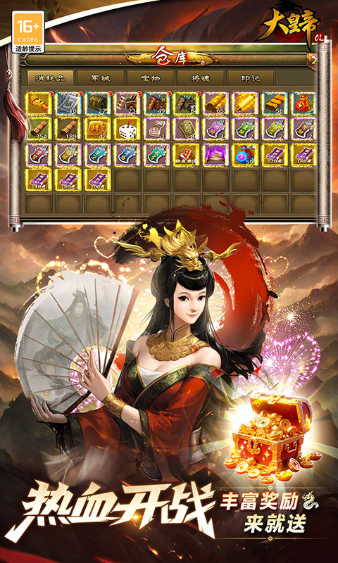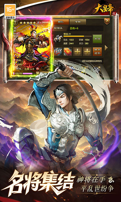 大皇帝手游》一款为策略游戏用户量身定制的三国SLG。 128座城池,组建自己的势力,亲身参与东汉末年争夺天下霸权的三国征途!玩家亲临乱世汉末,击杀叛贼,临危受命,一举称帝,就此展开一条别样的三国帝王之路。 在《大皇帝OL》中,您可以不断地开疆扩土,收复更多的领地,每一座城池都能为您之后提供大量收益,英雄,银两,宝物通通在手! 问鼎江山还不够,成为最强帝王才是正道。 王者之巅,争夺积分名次,从草根组攀登至尊组;诸侯争霸,经历数轮淘汰,登顶全服帝王宝座。成为无数豪杰仰视的真正大皇帝!
